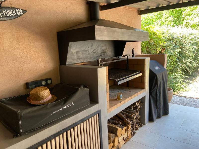 L’élément central de ce pool house est un barbecue argentin encastré, conçu pour des cuissons au feu de bois dans la plus pure tradition sud-américaine. Autour de cette pièce maîtresse, une cuisine d’été fonctionnelle a été intégrée : plan de travail, évier extérieur, et rangements sur-mesure complètent l’ensemble, barbecue électrique et plancha.
