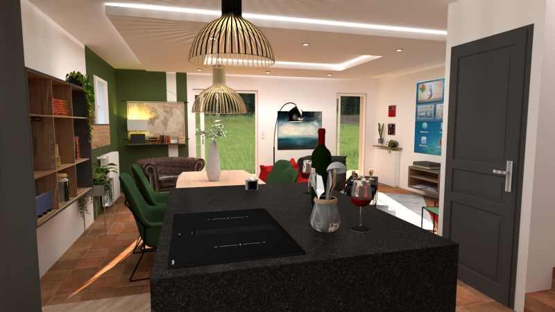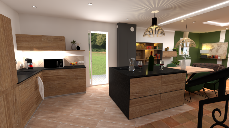 cuisine ouverte avec grand ilot central devenu la pièce maitresse de la maison.