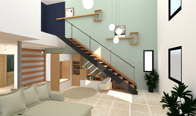 Du rangement a été pensé sur le dessus ainsi que sur la longueur du mur de l'escalier pour combler le manque.